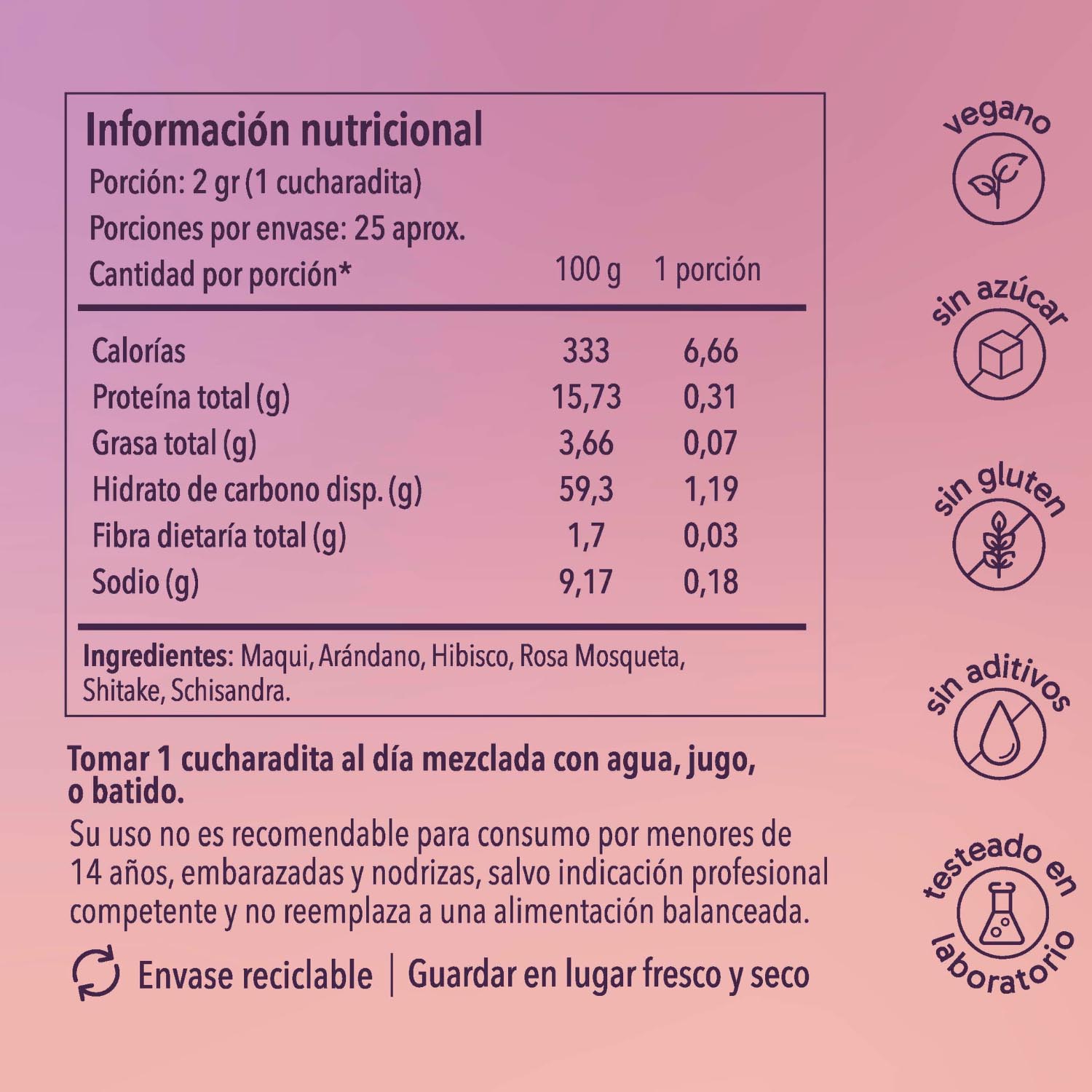 Rosa Mosqueta, Schisandra, Maqui, Arándano, Hibisco, Shiitake.