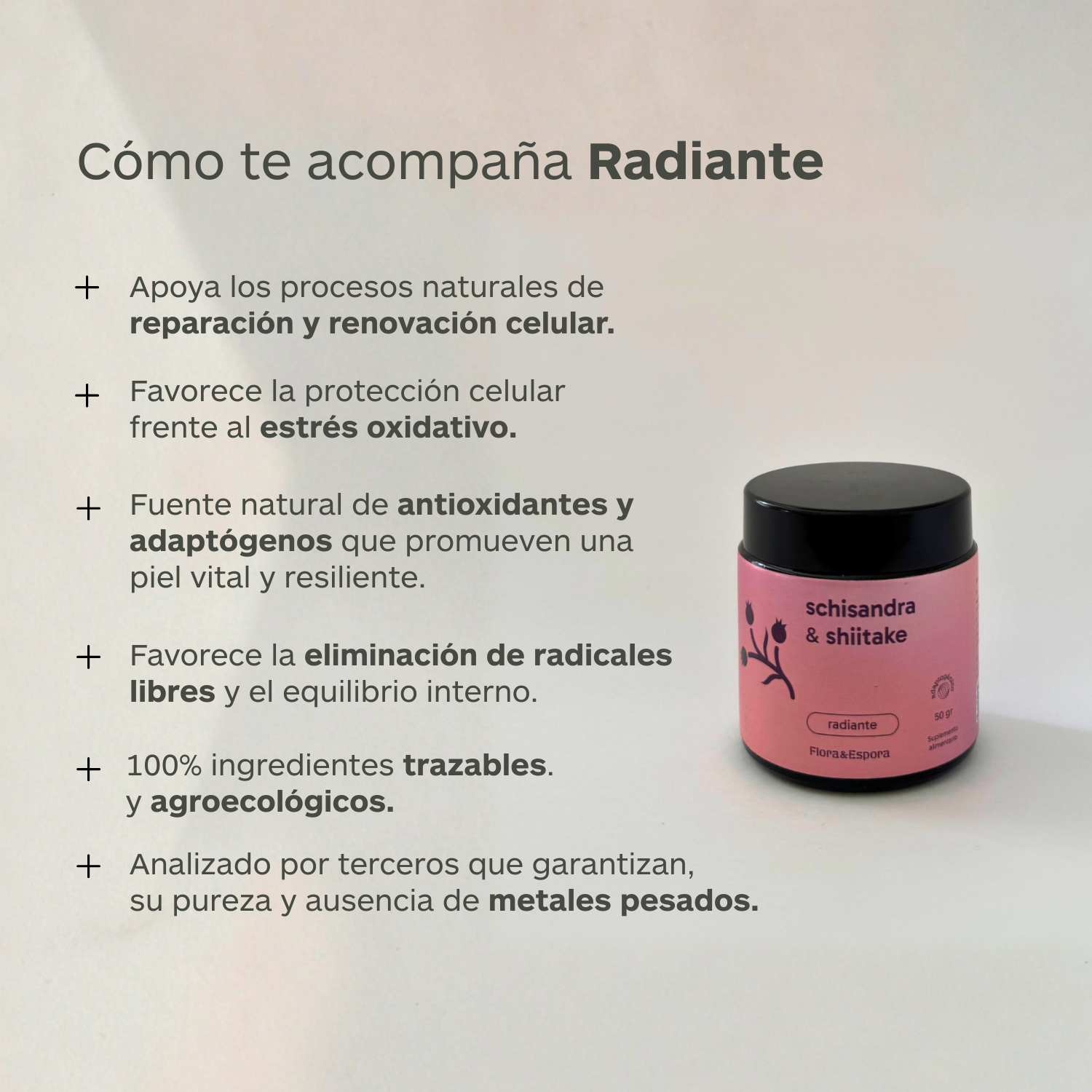 Radiante actúa como un modulador antioxidante y regenerativo sistémico. Su mezcla de rosa mosqueta, maqui, schisandra, shiitake, arándanos e hibisco aporta altos niveles de vitamina C, que reduce el estrés oxidativo y promueve la regeneración celular. También apoya la adaptación al estrés, la energía vital y la longevidad metabólica. En dosis diarias de 2 grs, contribuye a una piel más luminosa, favorece una mayor resiliencia y protección frente al envejecimiento celular, con efectos que se acumulan de forma progresiva con su uso constante.